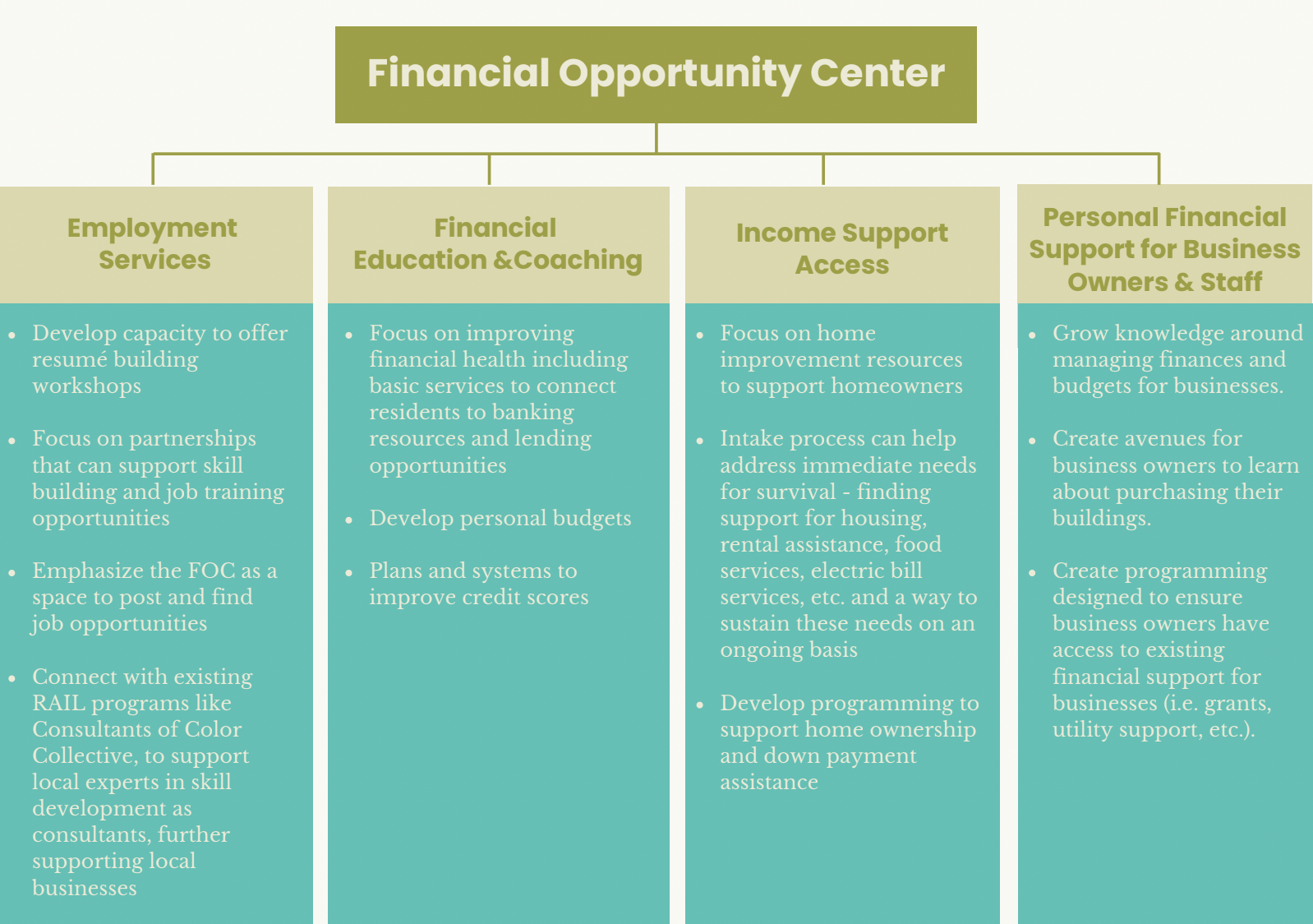 This report outlines the work that was done to engage the Southside neighborhood community and surrounding businesses in a discussion about a new Financial Opportunity Center (FOC) that will be run through RAIL CDC. The community participated in three “platicas,” or community conversations, in both English and Spanish, that offered creative engagement opportunities for participants to share their priorities and immediate needs and how those might be supported through RAIL’s existing programs and the work of the FOC.